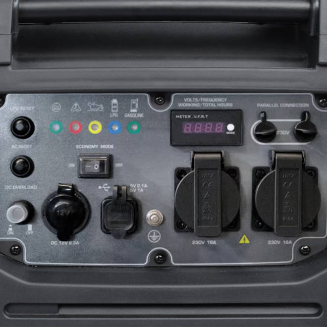 Ergonomiczny panel sterujący wyposażony jest w: wyświetlacz LED, dwa porty USB 5 V/1 A, 5 V/2,1 A, gniazdo 12V, przełącznik trybu ekonomicznego, wskaźniki stanu pracy, złącze do równoległego podłączenia generatorów w celu uzyskania podwójnego zasilania oraz przycisk RESET do ponownego uruchomienia systemu sterowania (w przypadku zadziałania wyłącznika) i przywrócenia napięcia zasilającego.