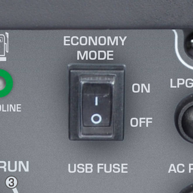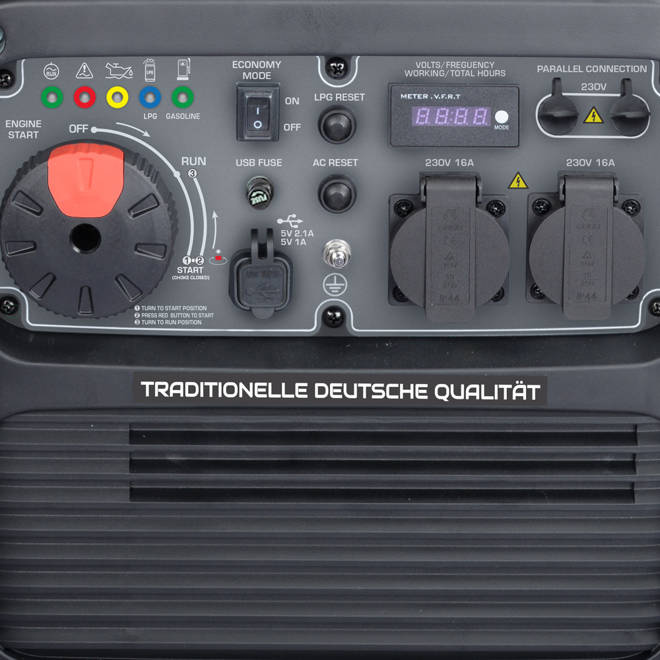Wygodne zlokalizowanie wszystkich funkcji: wielofunkcyjny wyświetlacz LED (licznik godzin pracy, napięcie, częstotliwość), wskaźniki monitorowania pracy generatora prądotwórczego pokazują: aktualny stan pracy, informacje w przypadku przeciążenia lub zwarcia oraz o niskim poziomie oleju, przycisk Reset do ponownego uruchomienia systemu kontroli i wznowienia zasilania, złącze do równoległego podłączenia generatorów, dwa wyjścia USB (5V/1A, 5V/2.1A) pozwala na podłączenie gadżetów, gniazda 230V oraz zacisk uziemienia.