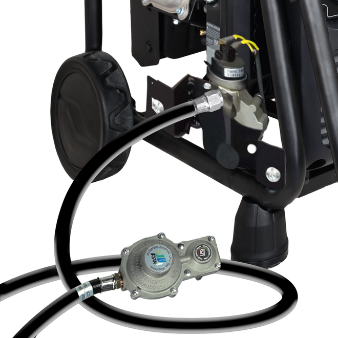 - Dodatkowy reduktor na wężu, który zwiększa niezawodność łącza gazowego, obniża poziom ciśnienia i eliminuje możliwość przeciążenia przyłącza gazu. Wszystko, co musisz zrobić, to podłączyć generator do butli i uruchomić silnik.