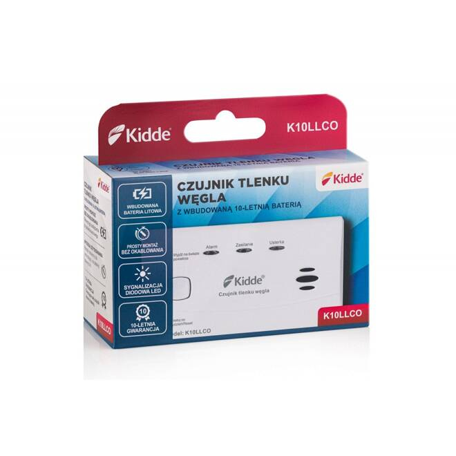- Czujnik tlenku węgla K10LLCO wyposażony w sensor elektrochemiczny Kidde, gwarantujący 10-letni okres pracy.