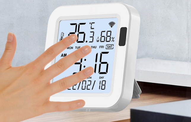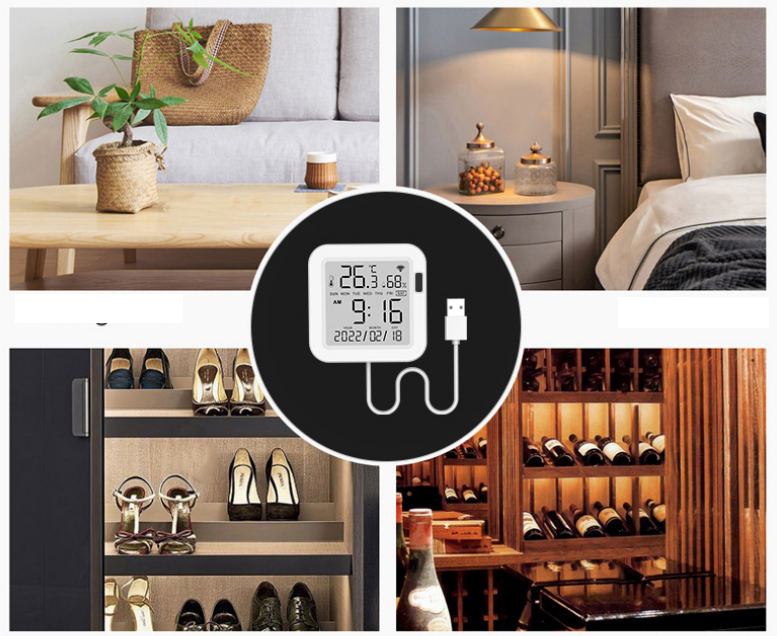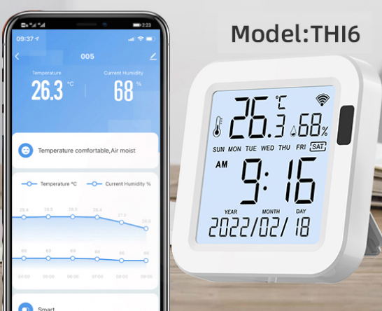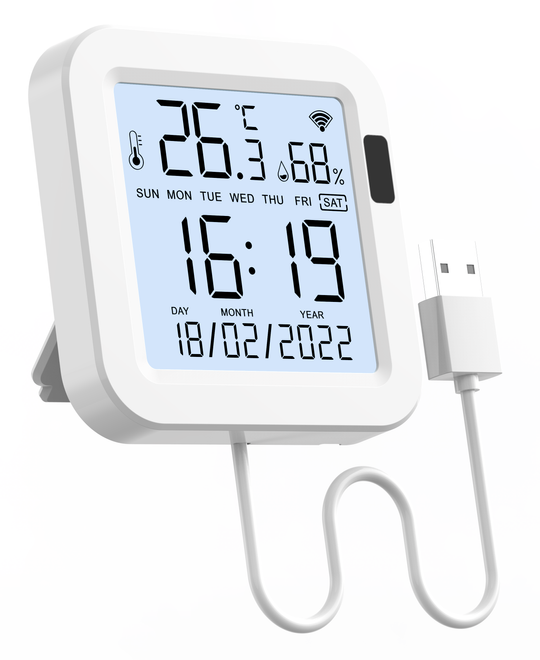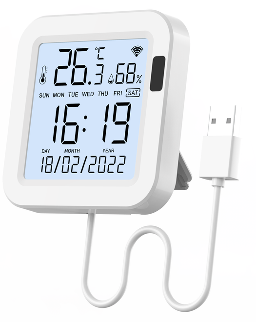 - Inteligentny higrometr z termometrem i WiFi umożliwia pomiar wilgotności i temperatury w czasie rzeczywistym. Wyposażony w duży wyświetlacz LCD i funkcję automatycznego podświetlenia, zdalne sterowanie przez aplikację Smart Life.
