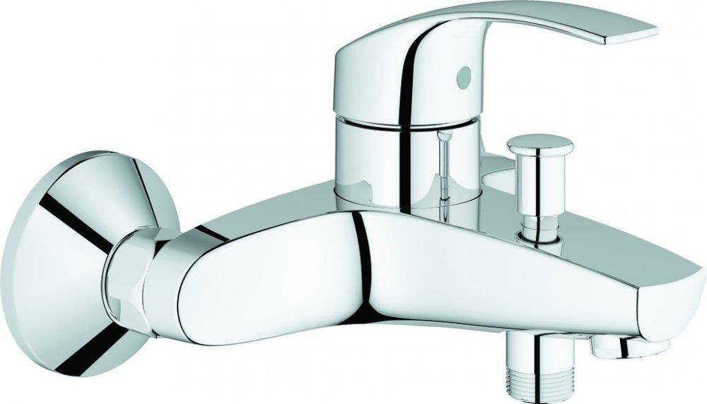 Eurosmart jednouchwytowa bateria wannowa montaż ścienny metalowa dźwignia głowica ceramiczna 35 mm z GROHE SilkMove z ogranicznikiem temperatury regulowany ogranicznik strumienia przepływu powłoka chromowa z GROHE StarLight automatyczny przełącznik: wanna/prysznic zintegrowany zawór zwrotny w wyjściu prysznica 1/2" perlator przyłącza S metalowa rozeta ścienna zabezpieczenie przed przepływem zwrotnym