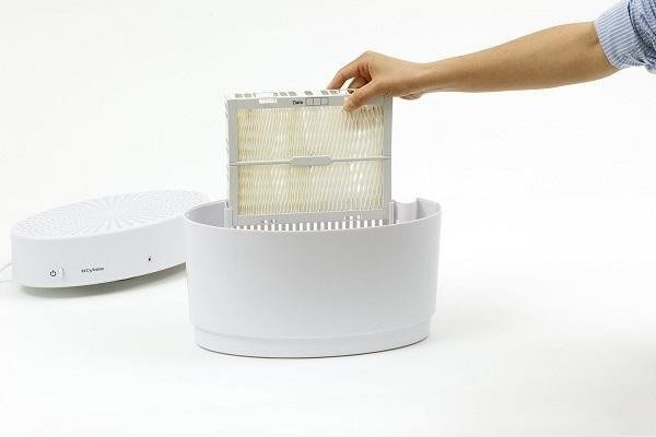 • Zintegrowany wentylator – zaciąga suche powietrze przez nasączone wodą antybakteryjne kasety filtracyjne, gdzie jest ono nawilżane do naturalnego poziomu.