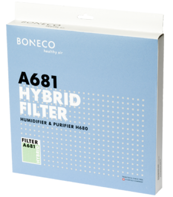 To połączenie wysokosprawnego filtra HEPA oraz filtra z aktywnym węglem. Innowacyjna powłoka filtra HEPA niszczy 99% wszystkich wirusów i bakterii, usuwa z powietrza pyłki, drobne cząsteczki i roztocza, zarodniki grzybów, mikroorganizmy, zmniejszając w ten sposób reakcje alergiczne u osób przebywających w pomieszczeniu. Filtr z węglem aktywnym redukuje dym tytoniowy, zapachy z kuchni, a także szkodliwe gazy, takie jak lotne związki organiczne, pył zawieszony PM 2,5, formaldehyd, spaliny. Filtr BONECO A681 HYBRID przeznaczony jest do nawilżacza i oczyszczacza BONECO H680.