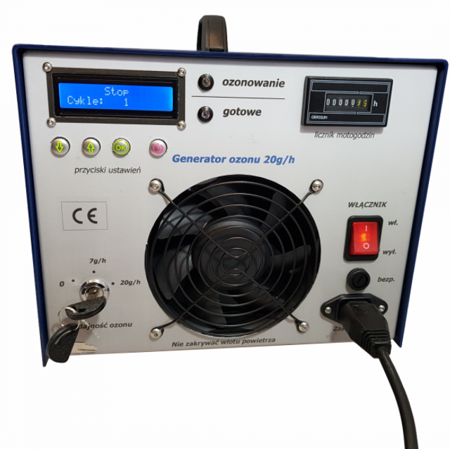 Produkowany przez firmę Blue Planet generator ozonu DS-20-R o regulowanej mocy 7g/h lub 20g/h jest dedykowany do ozonowania pojazdów, systemów wentylacji stacjonarnej, sterylizacji pomieszczeń, biurowych, mieszkalnych, przemysłowych o kubaturze do 500m3 Funkcja wyciągu ozonu - po zabiegu należy wystawić jeden koniec przewodu elastycznego np. przez okno lub kanał wentylacyjny i włączyć generator ozonu bez produkcji ozonu Urządzenie jest wyposażone w wysokiej wydajności przetwornice wysokiego napięcia chłodzone powietrzem i wentylowane elementy emitujące wyładowania koronowe. Ozonowanie jest najskuteczniejszą formą dezynfekcji klimatyzacji samochodowej, stacjonarnej, przestrzeni ładunkowej samochodów ciężarowych oraz pomieszczeń mieszkalnych jak również strychów i piwnic. Generator ozonu gwarantuje profesjonalne i skuteczne wykonanie dezynfekcji oraz satysfakcję z dobrze wykonanej pracy. Do każdego generatora dołączony jest "Mały przewodnik ozonowania" - opis przygotowujący do pracy z ozonem. Pozwala wyjaśnić np. dobór stężeń ozonu, czas procesu, sposoby ozonowania kabin pojazdów, ozonowanie po pożarach itp.