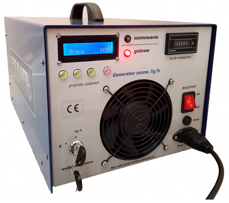 Urządzenie jest wyposażone w wysokiej wydajności przetwornice wysokiego napięcia chłodzone powietrzem i wentylowane elementy emitujące wyładowania koronowe. Ozonowanie jest najskuteczniejszą formą dezynfekcji klimatyzacji samochodowej, stacjonarnej, przestrzeni ładunkowej samochodów ciężarowych oraz pomieszczeń mieszkalnych jak również strychów i piwnic. Generator ozonu gwarantuje profesjonalne i skuteczne wykonanie dezynfekcji oraz satysfakcję z dobrze wykonanej pracy. Do każdego generatora dołączony jest "Mały przewodnik ozonowania" - opis przygotowujący do pracy z ozonem. Pozwala wyjaśnić np. dobór stężeń ozonu, czas procesu, sposoby ozonowania kabin pojazdów, ozonowanie po pożarach itp.