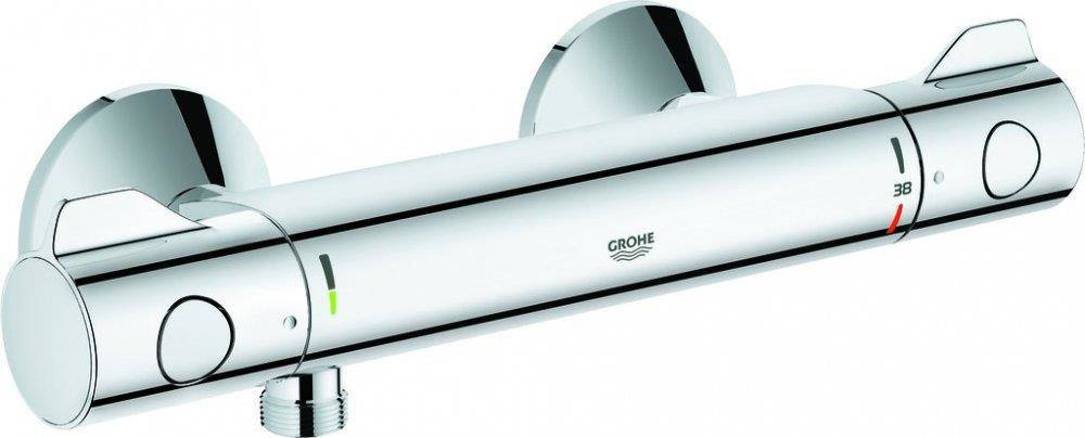 Grohtherm 800 bateria prysznicowa z termostatem, DN 15 montaż ścienny powłoka chromowa z GROHE StarLight głowica termostatyczna z GROHE TurboStat blokada GROHE SafeStop przy 38°C GROHE EcoJoy technologia dla zmniejszenia zużycia wody pokrętło z regulacją strumienia przepływu z przyciskiem oszczędnościowym GROHE EcoButton zintegrowana blokada wody mieszanej głowica ceramiczna 1/2", 180° wyjście prysznica na dole 1/2" wbudowane zawory zwrotne sitka do zanieczyszczeń przyłącza S metalowa rozeta zabezpieczenie przed przepływem zwrotnym min. rekomendowane ciśnienie - 1,0 bar