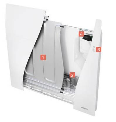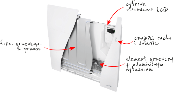 - Double - dwa oddzielne elementy grzewcze stanowią: element główny wykonany z aluminium oraz folia grzewcza pokrywająca przednią obudowę urządzenia, ich duża powierzchnia grzewcza jest stopniowo uwalniana do otoczenia, gwarantuje to jednakową temperaturę w każdej części pomieszczenia oraz wysoką jakość powietrza.