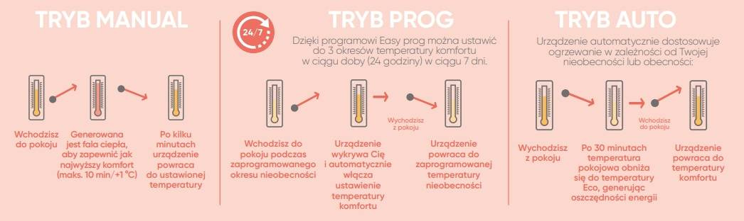• Komfort - praca urządzenia w zakresie gwarantującym otrzymanie i utrzymanie maksymalnie komfortowej temperatury ogrzewanego pomieszczenia, zgodnej z oczekiwaniem/ustawieniami użytkownika.
