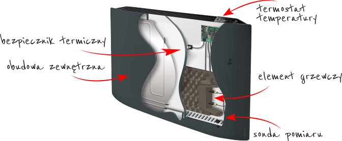 • Żeliwo - dzięki dużej powierzchni promieniowania cieplnego, energia zmagazynowana wewnątrz elementu grzewczego jest stopniowo oddawana do otoczenia, co gwarantuje jednakową temperaturę w każdej części pomieszczenia oraz najwyższą jakość ogrzanego powietrza na wyjściu z urządzenia.