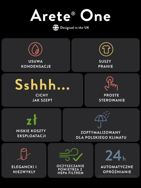 Osuszacz i oczyszczacz powietrza Arete® 12L należy do serii nowoczesnych urządzeń która jest wynikiem 5-letnich badań i projektowania opartego na ponad 2000 opinii użytkowników. Arete jest grecką boginią doskonałości we wszystkim i taka jest właśnie nasza Arete. Wyczerpująco zadbaliśmy o szczegóły, udoskonalając każdą interakcję między użytkownikiem a osuszaczem. Efektem końcowym jest nasza najcichsza i najbardziej energooszczędna gama osuszaczy powietrza, z szeregiem specjalnych funkcji, które sprawiają, że życie z Arete jest po prostu przyjemnością. Każdy model posiada medyczny filtr hepa H13 który można stosować zamiennie z filtrem węglowym. Dzięki Temu Arete jest także oczyszczaczem powietrza i może pracować jedynie z funkcją oczyszczania bez usuwania wilgoci. Wielofunkcyjny domowy osuszacz powietrza Arete to idealne rozwiązanie w przypadku problemów z kondensacją, pleśnią i wilgocią w domu, garażu, na łodzi lub w przyczepie kempingowej.