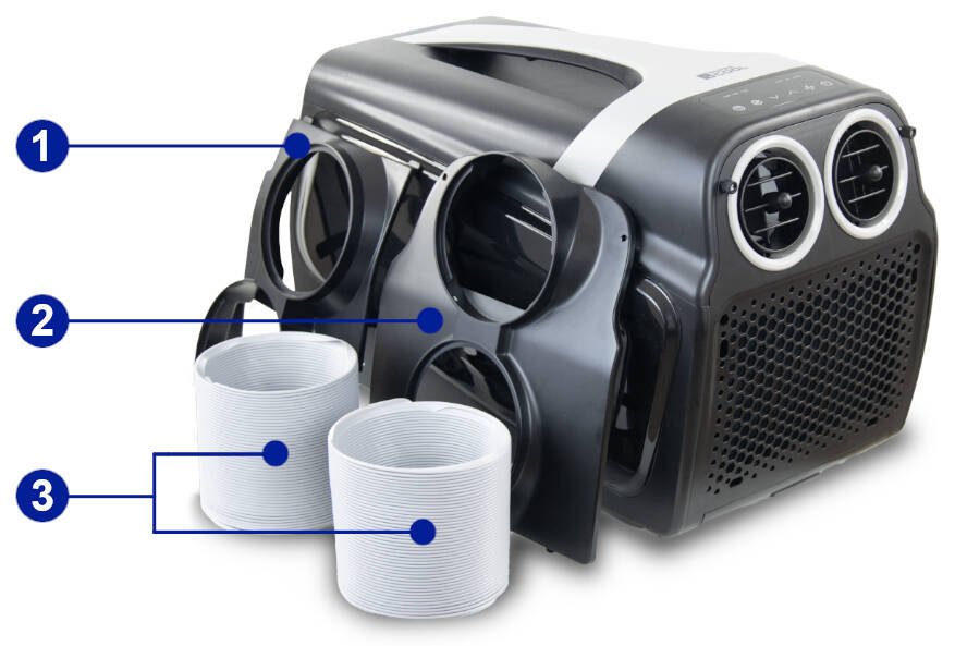 1. Adapter obiegu gorącego powietrza (instalacja klimatyzatora wewnątrz pomieszczenia) – Dzięki temu adapterowi, urządzenie pobiera świeże powietrze za pomocą rury wlotowej w celu schłodzenia klimatyzatora, a gorące powietrze (powstające podczas procesu chłodzenia) jest odprowadzane na zewnątrz za pomocą rury wylotowej.