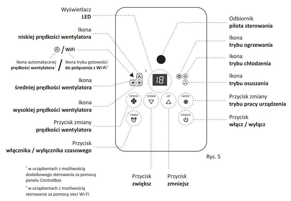 - 4 funkcje: chłodzenie, ogrzewanie, osuszanie, wentylacja,