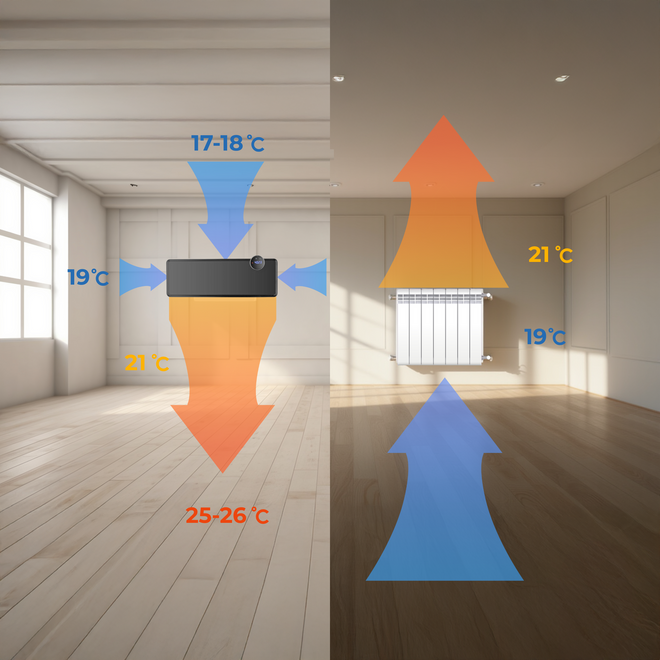 ✔️ Oscylacja SWING – ciepło rozprowadzane równomiernie, bez chłodnych stref.