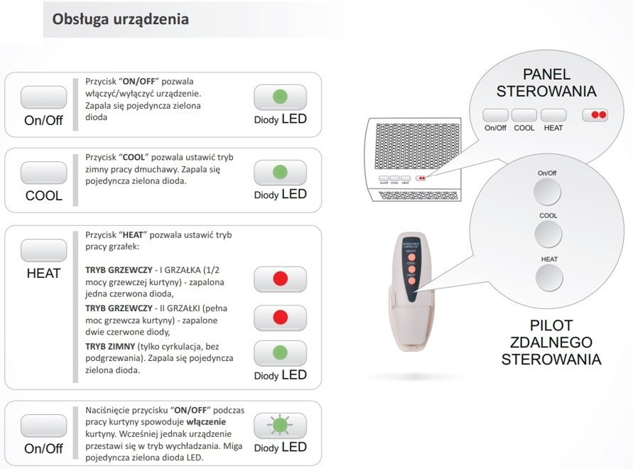 Kurtyna elektryczna WRS-04 jest wyposażona w energooszczędną grzałkę PTC. Obsługa urządzenia jest niezwykle prosta - na przednim panelu znajduje się układ sterowania z diodami LED, informującymi o trybie pracy. Dodatkowym ułatwieniem jest pilot zdalnego sterowania. Kolejnym atutem jest solidna obudowa wykonana ze stali lakierowanej proszkowo.