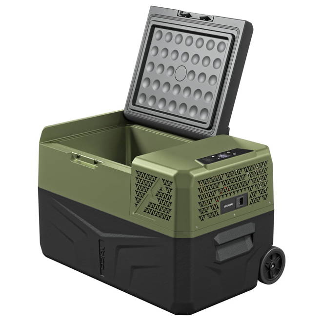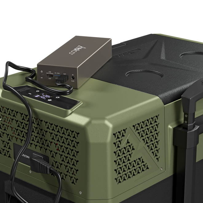 Lodówka może być zasilania prądem stałym (12/24V) lub zmiennym (100-240V). Posiada wielopoziomowe zabezpieczenie akumulatora pojazdu przed rozładowaniem oraz zabezpieczenie przeciwprzepięciowe chroniące przed nagłymi skokami napięcia w sieci elektrycznej. Lodówka kompresorowa Yolco posiada możliwość podłączenia zewnętrznej baterii zasilającej (do kupienia osobno). Panel sterowania z czytelnym ekranem ciekłokrystalicznym umożliwi Ci intuicyjne sterowanie urządzeniem. Pojemność 28 l umożliwi Ci przechowywanie większych zapasów żywności czy innych produktów wymagających chłodzenia. Lodówka posiada ergonomiczne uchwyty, dzięki którym w łatwy sposób możesz ją przetransportować.