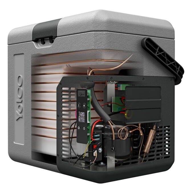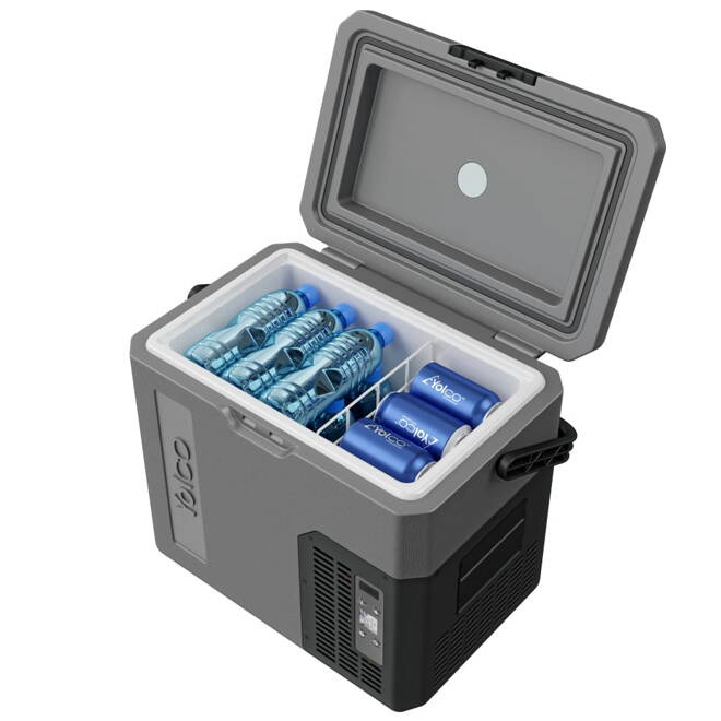 - Yolco ET18 Carbon – kompaktowa lodówka z chłodzeniem do -20°C, Bluetooth, slotem na 2 baterie i gniazdem USB. Idealna do kampera i auta!