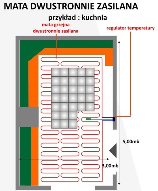 ✓ Matę grzejną można układać w dowolny sposób poprzez cięcie siatki i obracanie maty w odpowiednim kierunku. W miejscach, gdzie nie można ułożyć maty grzejnej - przewód maty można odłączyć od siatki lub ciąć siatkę na wąskie paski, tak aby umożliwić dowolny sposób układania przewodu.