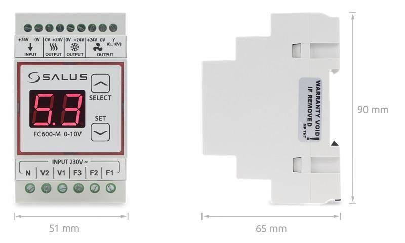 Moduł dla klimakonwektorów, grzejników kanałowych lub nagrzewnic z wentylatorami sterowanymi sygnałem 0-10V. Jest uzupełnieniem regulatora głównego SALUS FC600. Moduł płynnie steruje prędkością wentylatora poprzez zadawanie napięcia sterującego w zakresie od 0...10V. Urządzenie steruje dwoma siłownikami elektrycznymi (zawór grzania i chłodzenia).