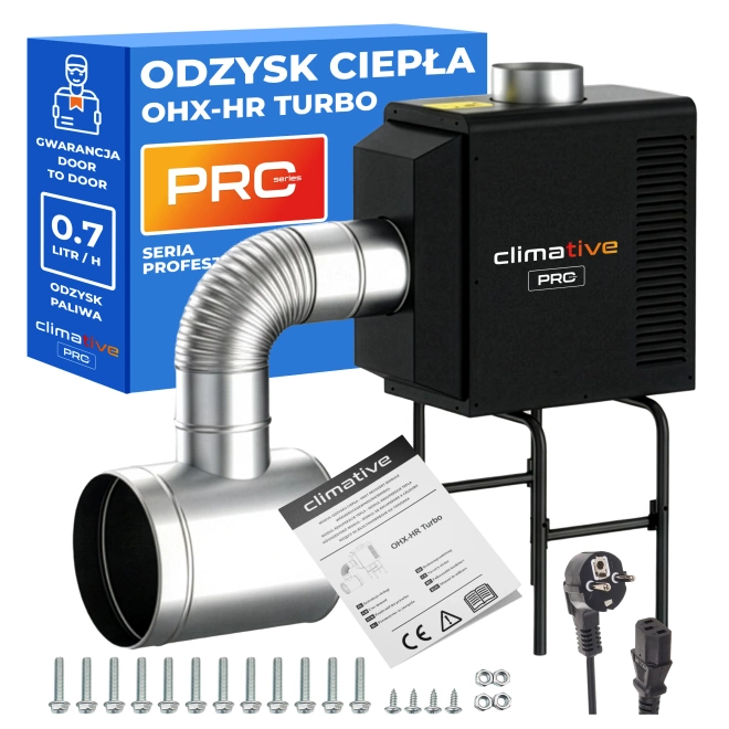 Climative OHX-HR Turbo to nowoczesny moduł odzysku ciepła przeznaczony do współpracy z nagrzewnicami olejowymi serii OHX. Montuje się go bezpośrednio na wylocie spalin, gdzie pełni funkcję dodatkowego wymiennika ciepła. W tradycyjnym działaniu nagrzewnicy gorące spaliny są odprowadzane na zewnątrz, co wiąże się ze stratą znacznej ilości energii. OHX-HR Turbo pozwala tę energię odzyskać, wychwytując ciepło ze spalin i przekazując je z powrotem do powietrza w pomieszczeniu. Dzięki temu urządzenie zwiększa efektywność ogrzewania, umożliwia szybsze osiąganie zadanej temperatury oraz realnie obniża zużycie paliwa — nawet o 0,7 litra oleju na godzinę pracy. Jednocześnie redukuje emisję CO₂, czyniąc ogrzewanie bardziej ekologicznym. To rozwiązanie, które łączy oszczędność, wygodę i dbałość o środowisko, sprawiając, że nagrzewnice OHX pracują jeszcze wydajniej i ekonomiczniej.