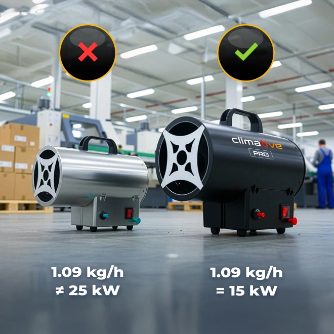 Na rynku można znaleźć nagrzewnice reklamowane jako 25 kW, mimo że ich spalanie wynosi zaledwie 1,09 kg/h. W rzeczywistości uzyskanie takiej mocy przy tak niskim zużyciu paliwa jest fizycznie niemożliwe.