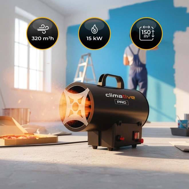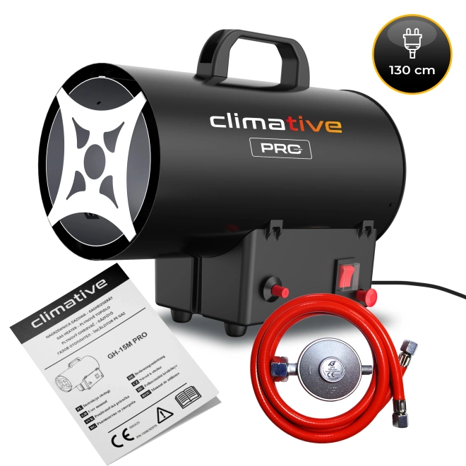 - Climative GH-15M to gazowa nagrzewnica o mocy 15 kW. Ogrzewa do 150 m², ma przepływ 320 m³/h zużycie 1,09 kg/h. Zapłon piezo, posiada termostat. W zestawie reduktor i przewód. Lekka mobilna, gotowa do pracy. Solidna obudowa.