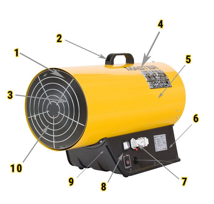 Zimne powietrze jest zasysane do urządzenia przez wentylator i kierowane w stronę wylotu nagrzewnicy, gdzie ogrzewane jest przez płomień. Ciepłe powietrze wylatuje przodem.