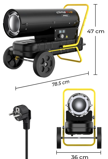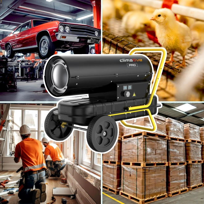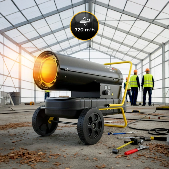 - Nagrzewnica olejowa Climative OH-30 PRO o mocy 30 kW zapewnia szybkie ogrzewanie dużych przestrzeni. Zużywa 2,4 l/h paliwa, działa do 9 h, ma zbiornik 22 l, termostat LED, zabezpieczenia i kółka transportowe – idealna do hal, warsztatów i budów.