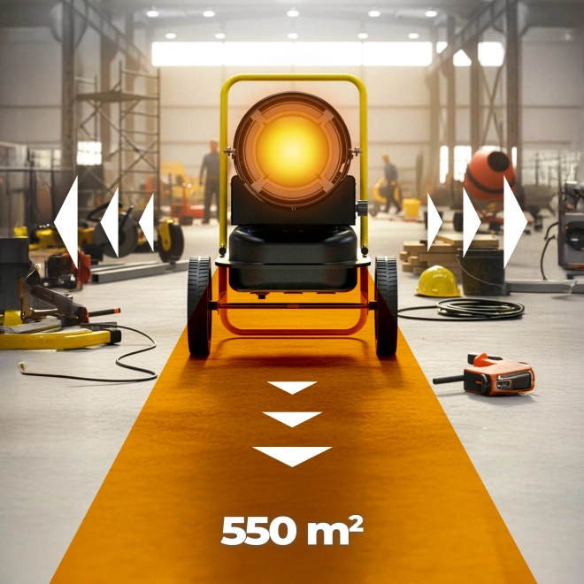 🔵 Przeznaczona do dużych przestrzeni – skutecznie ogrzewa powierzchnię do ok. 300 m², idealna do warsztatów, hal, magazynów, placów budowy czy gospodarstw rolnych.