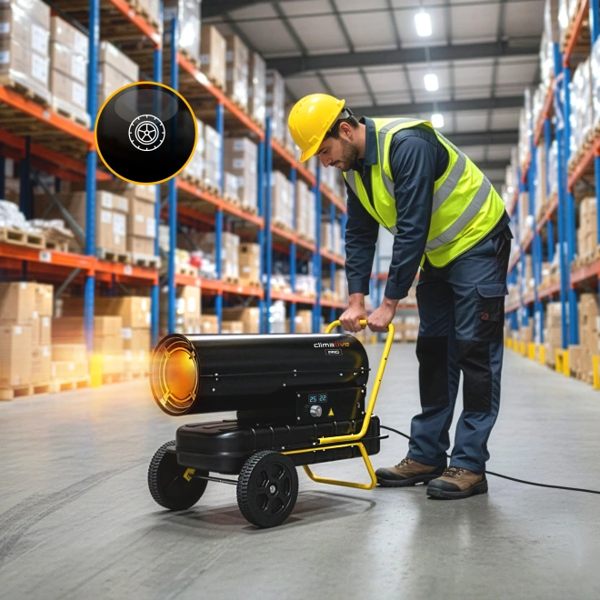 🔵 Kółka transportowe w zestawie – standardowe wyposażenie gwarantuje pełną mobilność urządzenia, pozwalając na szybkie i bezwysiłkowe przemieszczanie nagrzewnicy po hali, magazynie czy terenie budowy.