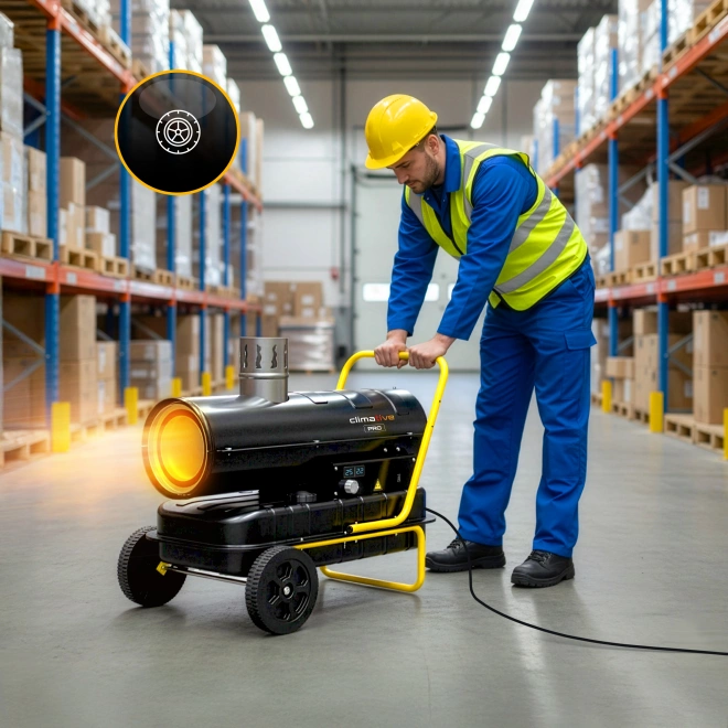 🔵 Wygodne kółka transportowe – umożliwiają swobodne i bezwysiłkowe przemieszczanie nagrzewnicy po hali, magazynie czy placu budowy.