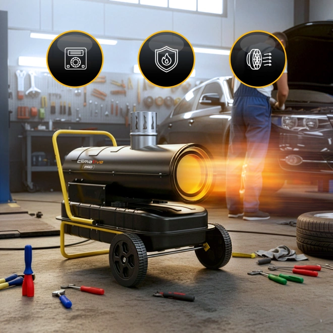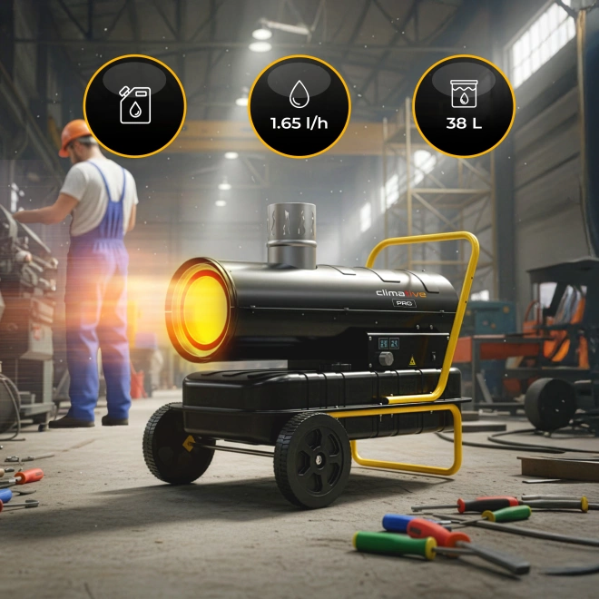 - Profesjonalne ogrzewanie hal i warsztatów. Moc 20 kW, spalanie 1,65 l/h, zbiornik 38 l, do 23 h pracy i odprowadzanie spalin na zewnątrz.