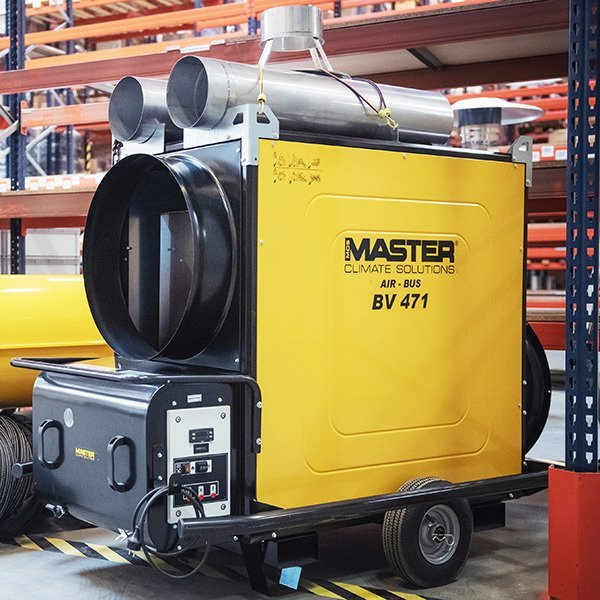 Nagrzewnica olejowa Master AIR-BUS BV 471 SR z odprowadzeniem spalin to wysoce wydajne urządzenie zapewniające dopływ w 100% czystego, suchego i pozbawionego dymu ciepłego powietrza. Doskonale nadają się do miejsc, w których wentylacja jest ograniczona, takich jak sklepy, namioty imprezowe, czy hale wystawowe. Nagrzewnice z odprowadzeniem spalin firmy Master są zarówno wydajne, trwałe, jak i bezpieczne i proste w obsłudze. Zimne powietrze jest zasysane do urządzenia przez wentylator i kierowane w stronę wylotu nagrzewnicy. Paliwo jest pobierane ze zbiornika, a następnie wtryskiwane przez dyszę do komory spalania, powstałe w wyniku tego procesu ciepło, ogrzewa strumień powietrza okalający i przechodzący przez komorę spalania. Wynik spalania, czyli spaliny tłoczony jest kominem.