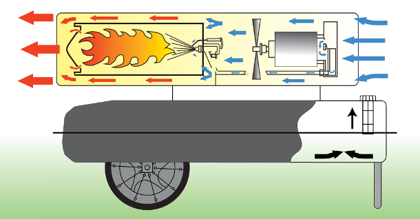 Nagrzewnica olejowa Master B 150 CED bez odprowadzenia spalin to wysoce wydajne urządzenie zapewniające stały dopływ dużych ilości ogrzanego powietrza tam, gdzie jest ono pożądane. Modele z wersji CED są bardzo wydajnymi i wytrzymałymi urządzeniami, którymi możemy regulować temperaturę grzania za pomocą termostatu TH 5. Doskonale nadają się do otwartych lub dobrze wentylowanych powierzchni, takich jak fabryki, magazyny lub na terenie budów. Nagrzewnice bez odprowadzenia spalin firmy Master są zarówno wydajne, trwałe, jak i bezpieczne i proste w obsłudze. Zimne powietrze jest zasysane do urządzenia przez wentylator i kierowane w stronę wylotu nagrzewnicy. Paliwo jest pobierane ze zbiornika, a następnie wtryskiwane przez dyszę do komory spalania, powstałe w wyniku tego procesu ciepło, ogrzewa strumień powietrza okalający i przechodzący przez komorę spalania. Wynik spalania, czyli spaliny tłoczony jest z ciepłym powietrzem.