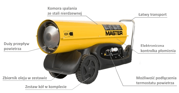 Nagrzewnice olejowe Master wyposażone są w liczne udogodnienia, mające również znaczący wpływ na bezpieczeństwo użytkowania. Posiadają system chroniący silnik przed przegrzaniem, a także komorę spalania ze stali nierdzewnej. Co więcej, ich kompaktowa konstrukcja oraz znajdująca się na górnej części solidnej obudowy rączka, zdecydowanie ułatwiają przenoszenie.