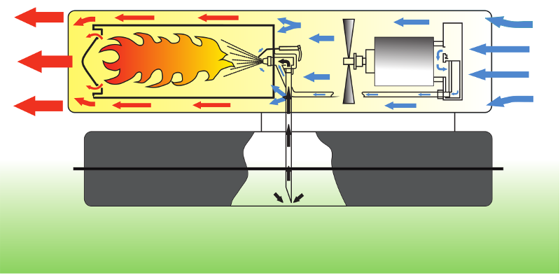 Nagrzewnica olejowa Master B 300 CED bez odprowadzenia spalin to wysoce wydajne urządzenie zapewniające stały dopływ dużych ilości ogrzanego powietrza tam, gdzie jest ono pożądane. Modele z serii CED są bardzo wydajnymi i wytrzymałymi urządzeniami, którymi możemy regulować temperaturę grzania za pomocą termostatu TH 5. Doskonale nadają się do otwartych lub dobrze wentylowanych powierzchni, takich jak fabryki, magazyny lub na terenie budów. Nagrzewnice bez odprowadzenia spalin firmy Master są zarówno wydajne, trwałe, jak i bezpieczne i proste w obsłudze. Zimne powietrze jest zasysane do urządzenia przez wentylator i kierowane w stronę wylotu nagrzewnicy. Paliwo jest pobierane ze zbiornika, a następnie wtryskiwane przez dyszę do komory spalania, powstałe w wyniku tego procesu ciepło, ogrzewa strumień powietrza okalający i przechodzący przez komorę spalania. Wynik spalania, czyli spaliny tłoczony jest z ciepłym powietrzem.
