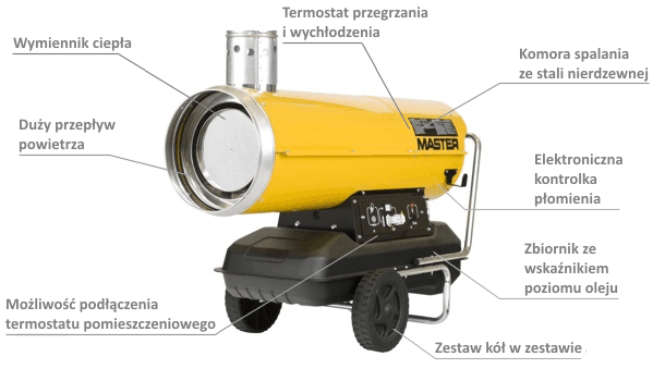 Nagrzewnice olejowe Master wyposażone są w liczne udogodnienia, mające również znaczący wpływ na bezpieczeństwo użytkowania. Posiadają system chroniący silnik przed przegrzaniem, a także komorę spalania ze stali nierdzewnej. Co więcej, ich kompaktowa konstrukcja oraz znajdująca się na górnej części solidnej obudowy rączka, zdecydowanie ułatwiają przenoszenie.