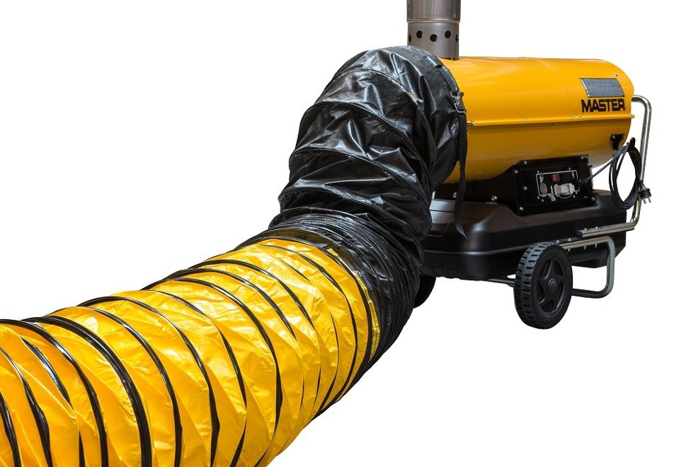 Nagrzewnica olejowa Master BV 110 E z odprowadzeniem spalin to wysoce wydajne urządzenie zapewniające dopływ w 100% czystego, suchego i pozbawionego dymu ciepłego powietrza. Doskonale nadaje się do miejsc, w których wentylacja jest ograniczona, takich jak sklepy, namioty imprezowe, bary szybkiej obsługi czy hale wystawowe. Nagrzewnice z odprowadzeniem spalin firmy Master są zarówno wydajne, trwałe, jak i bezpieczne i proste w obsłudze. Zimne powietrze jest zasysane do urządzenia przez wentylator i kierowane w stronę wylotu nagrzewnicy. Paliwo jest pobierane ze zbiornika, a następnie wtryskiwane przez dyszę do komory spalania, powstałe w wyniku tego procesu ciepło, ogrzewa strumień powietrza okalający i przechodzący przez komorę spalania. Wynik spalania, czyli spaliny tłoczony jest kominem.