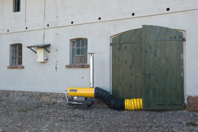 Na zdjęciu obok widać poprawny sposób odprowadzania spalin za pomocą komina. Podłączając dodatkową rurę odprowadzającą spaliny należy pamiętać, aby przed odejściem w bok poprowadzić ją co najmniej 2 metry pionowo w górę żeby spaliny się nie cofały i proces ich odprowadzania przebiegał sprawnie. Nagrzewnice z odprowadzaniem spalin idealnie sprawdzają się we wszystkich pomieszczeniach w których pracują ludzie. Możemy korzystać z nagrzewnicy bezpośrednio w budynku bez użycia przewodów giętkich, a spaliny odprowadzać na zewnątrz. Jest to idealne rozwiązanie do hal i wszelkich innych pomieszczeń o dużej kubaturze. Dzięki takiemu rozwiązaniu możemy cieszyć się bezpośrednim ciepłem prosto z nagrzewnicy nie narażając ludzi na wdychanie spalin.
