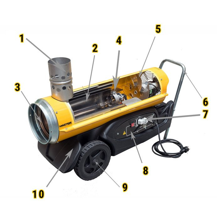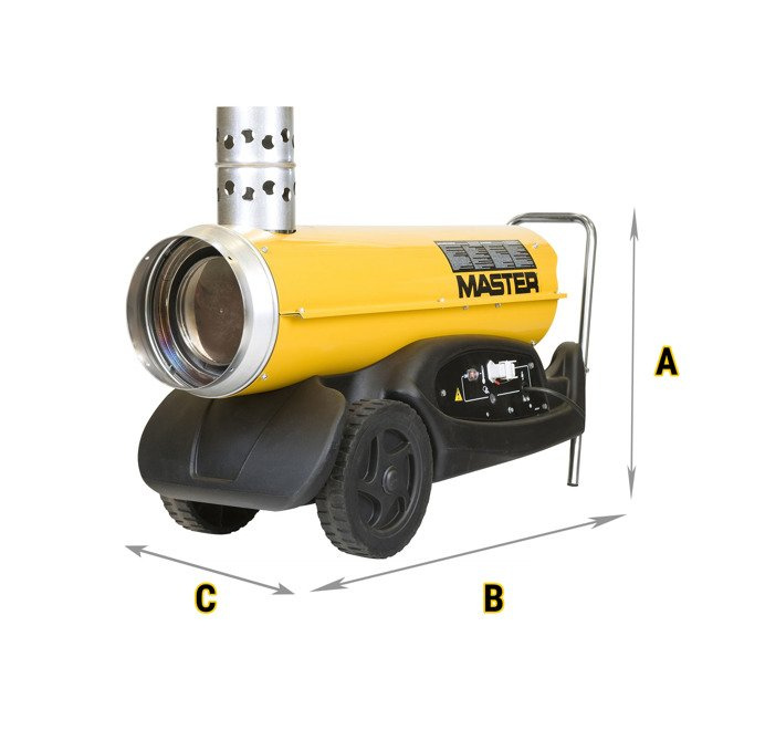 Nagrzewnica olejowa Master BV 77 E z odprowadzeniem spalin to wysoce wydajne urządzenie zapewniające dopływ w 100% czystego, suchego i pozbawionego dymu ciepłego powietrza. Doskonale nadaje się do miejsc, w których wentylacja jest ograniczona, takich jak sklepy, namioty imprezowe, bary szybkiej obsługi czy hale wystawowe. Nagrzewnice z odprowadzeniem spalin firmy Master są zarówno wydajne, trwałe, jak i bezpieczne i proste w obsłudze. Zimne powietrze jest zasysane do urządzenia przez wentylator i kierowane w stronę wylotu nagrzewnicy. Paliwo jest pobierane ze zbiornika, a następnie wtryskiwane przez dyszę do komory spalania, powstałe w wyniku tego procesu ciepło, ogrzewa strumień powietrza okalający i przechodzący przez komorę spalania. Wynik spalania, czyli spaliny tłoczony jest kominem.