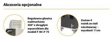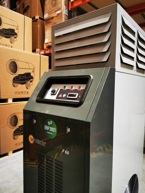 • Sovelor F 60 – stacjonarna nagrzewnica olejowa o mocy 59,63 kW z przepływem 6000 m³/h. Idealna do magazynów, hal i gospodarstw. Wysoka wydajność, funkcja lato-zima, automatyczny termostat, szybka instalacja. Profesjonalne ogrzewanie dla wymagających.