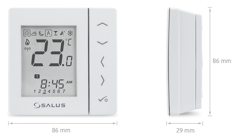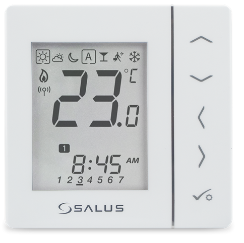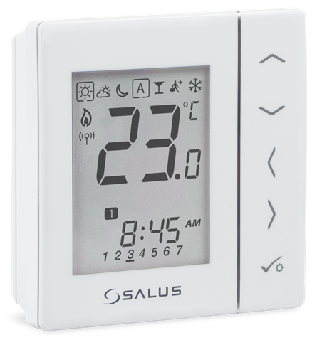 Natynkowy regulator temperatury służący do bezprzewodowego sterowania urządzeniami z serii SALUS Smart Home, takimi jak: listwa centralna KL08RF, głowica TRV i moduł sterujący RX10RF.