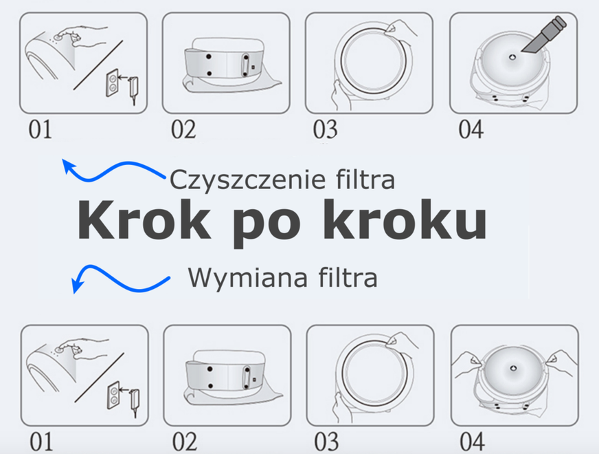 W pierwszej kolejności podłącz kabel zasilający w tylnej części urządzenia, wtyczkę podłącz do zasilania i naciśnij przycisk zasilania na urządzeniu. Otwórz tylną pokrywę i usuń widoczny kurz za pomocą odkurzacza raz w miesiącu. Wymień filtr co 18 miesięcy, jeśli korzystasz z oczyszczacza przez całą dobę. Okres ten może się zmieniać w zależności od środowiska, w którym oczyszczacz jest użytkowany.