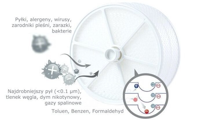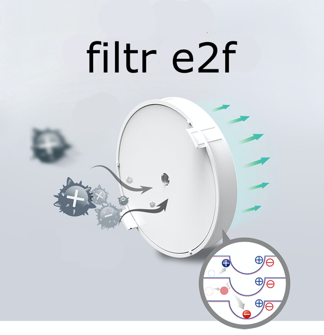 - Filtr e2f. Zatrzymuje najdrobniejsze cząstki, lotne związki organiczne (VOC), zarazki i bakterie. Nienaładowane cząsteczki zanieczyszczeń są wychwytywane przez ładunki elektrostatyczne na filtrze.