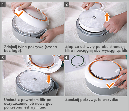 Po pierwsze, podłącz kabel z tyłu urządzenia do źródła zasilania, złącza w laptopie, komputerze lub powerbanku. Następnie wciśnij przycisk zasilający, aby włączyć. Otwórz tylną pokrywę i usuń widoczny kurz za pomocą odkurzacza raz w miesiącu. Wymień filtr raz w roku, jeśli korzystasz z oczyszczacza przez całą dobę. Okres ten może się zmieniać w zależności od środowiska, w którym oczyszczacz jest użytkowany.