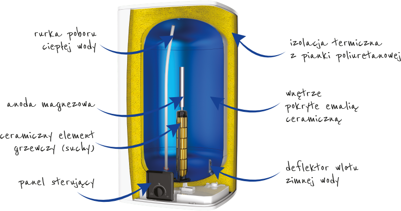 Bez widocznych podłączeń, jest łatwy i szybki w instalacji. Zapewnia łatwą konserwację, ponieważ element grzewczy można zdemontować bez konieczności spuszczania wody ze zbiornika.