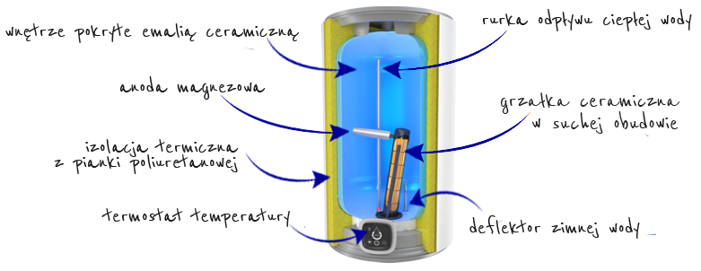 - Ceramiczny, suchy element grzewczy chroniony kryzą w celu ograniczenia osadzania się kamienia i łatwej konserwacji bez opróżniania zbiornika