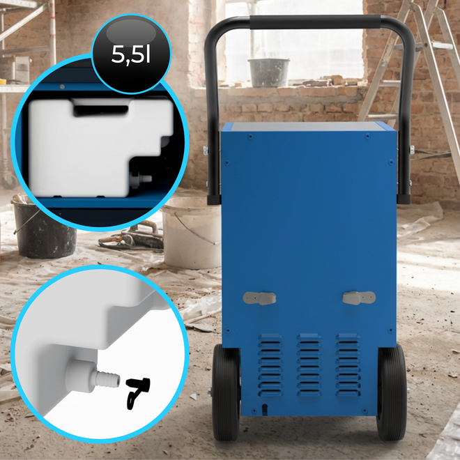 🟦 Urządzenie skutecznie usuwa duże ilości wilgoci w krótkim czasie, dzięki czemu idealnie sprawdza się przy osuszaniu po zalaniach, podczas remontów oraz w wymagających warunkach budowlanych.