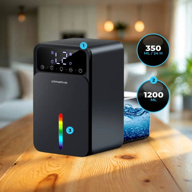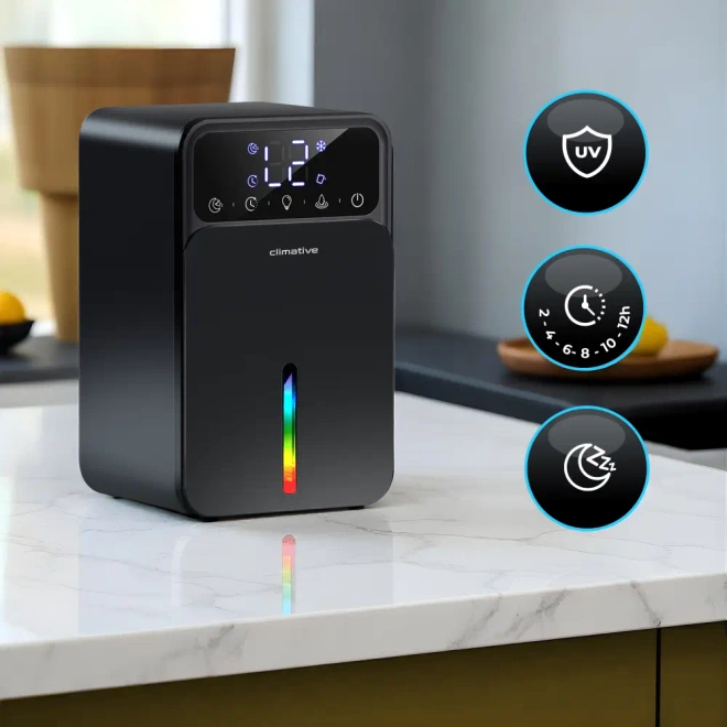 - Osuszacz powietrza Climative DH-035 Luxe UV usuwa do 350 ml/24h. Lampa UV eliminuje bakterie i wirusy, funkcja suszenia prania, higrostat, cicha praca. Skuteczna ochrona przed wilgocią i pleśnią, nowoczesny design i mobilność.