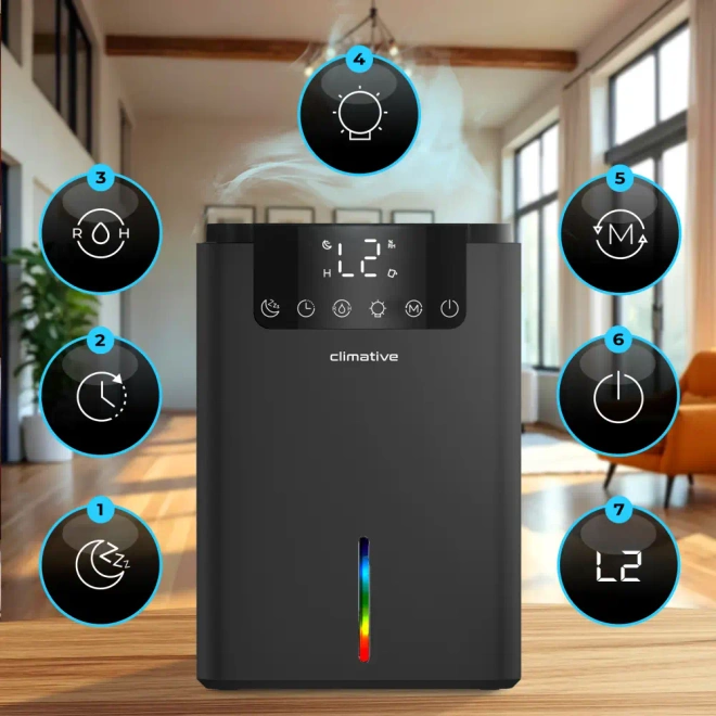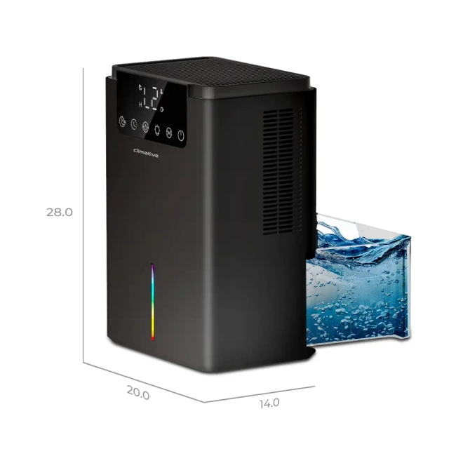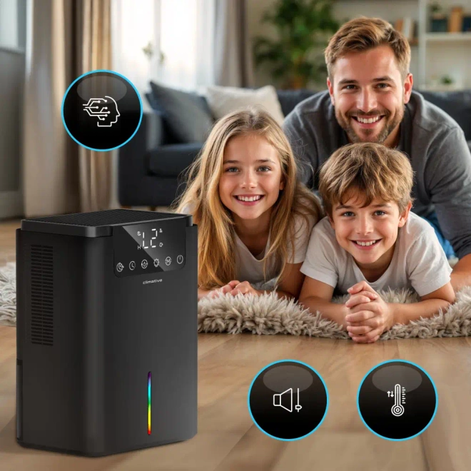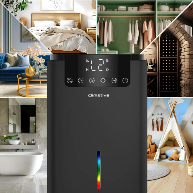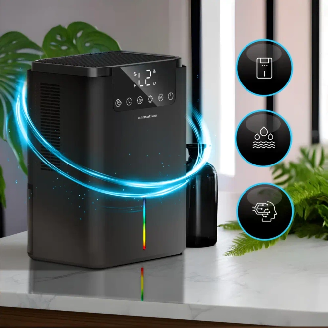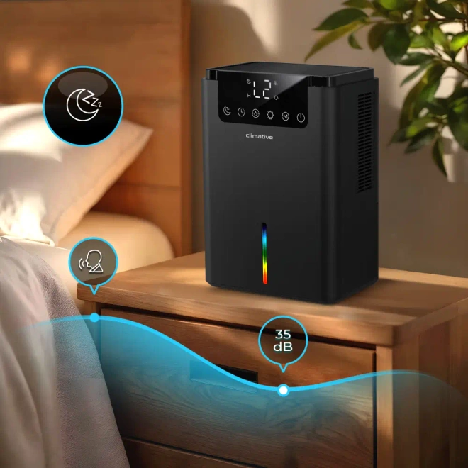 Osuszacz powietrza Climative Luxe DH-070 UV wyróżnia się wyjątkowo cichą pracą, dzięki czemu idealnie sprawdzi się w miejscach, gdzie liczy się komfort i spokój. Może być z powodzeniem używany zarówno w domu, jak i w biurze, nie zakłócając codziennych aktywności. Jego elegancki, nowoczesny design sprawia, że harmonijnie komponuje się z każdym wnętrzem.